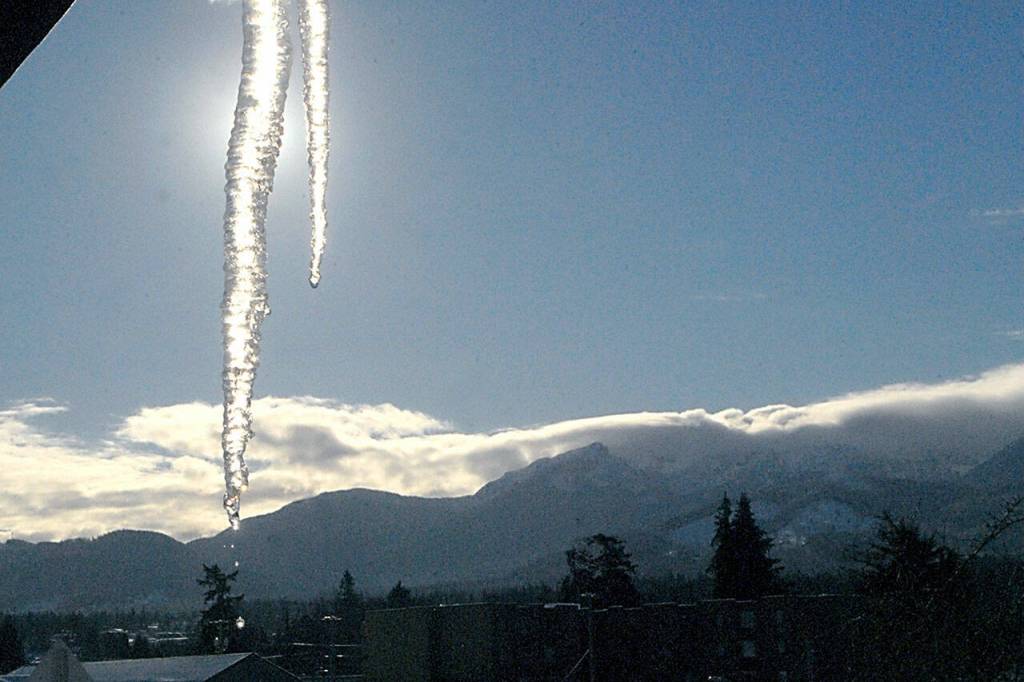 A pair of icicles hang from rooftop in Port Angeles as the temperature rose to just above freezing under the winter sun. Temperatures are expected to moderate in the coming week, signaling a return to seasonal conditions.