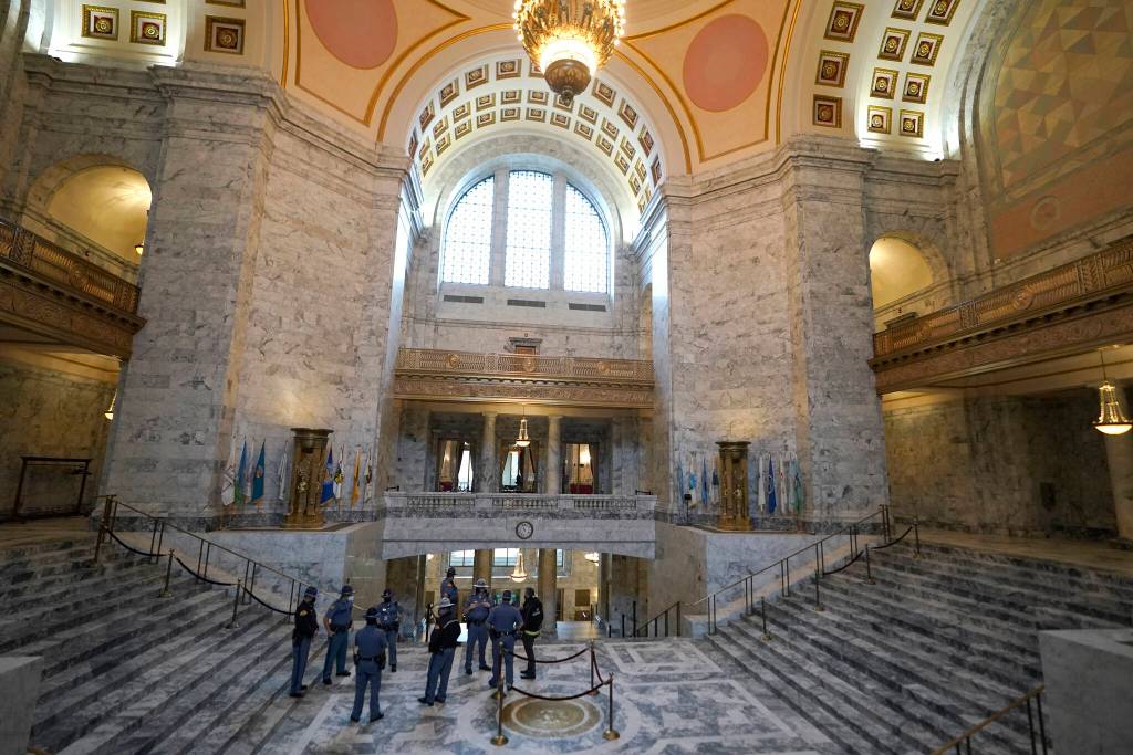Inslee delivered the speech in the Capitol’s state reception room, which was limited to a handful of attendees and media who had taken COVID-19 tests, and it was broadcast by TVW, the state’s government affairs channel.