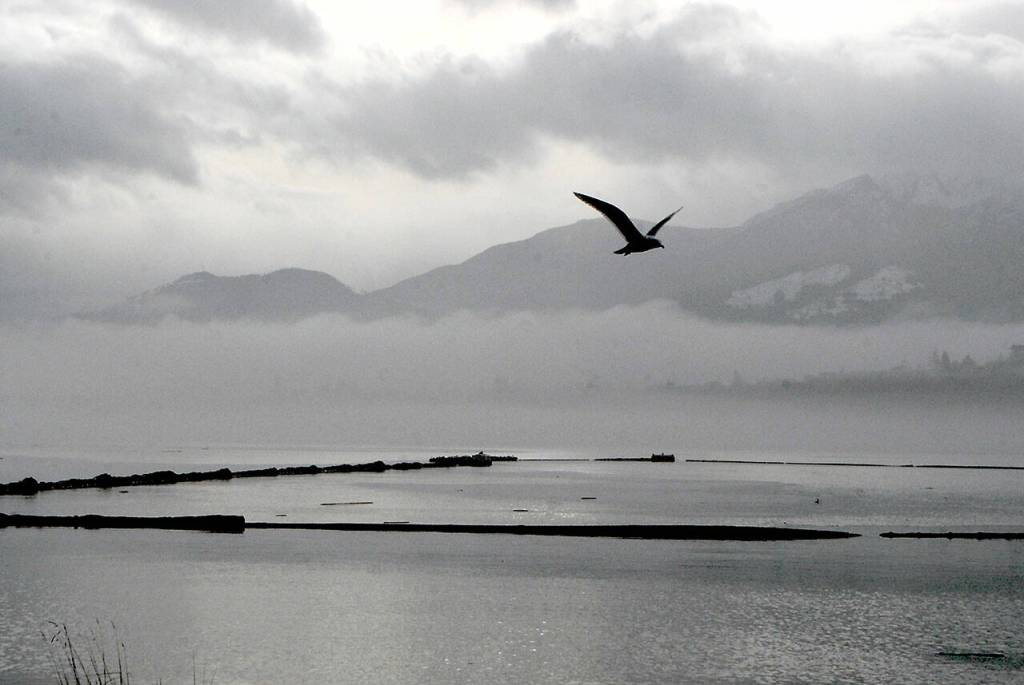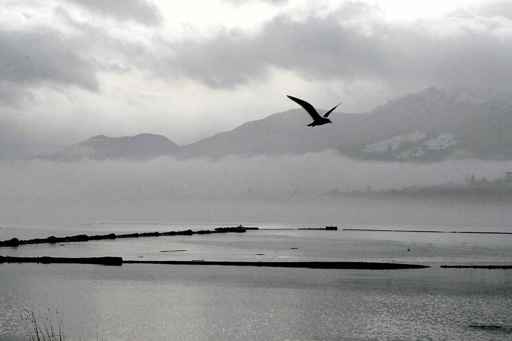 Peaks of the Olympic Foothills poke out from a layer of clouds and fog as a gull flies over Port Angeles Harbor on Wednesday. Unsettled weather is expected to give way to mostly cloudy skies before rain returns to the North Olympic Peninsula this weekend.