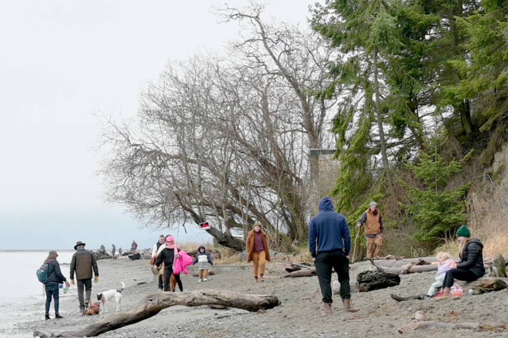 Port Williams Beach, north of Sequim, proved to be a popular destination for strollers and dog walkers Sunday with cloudy skies but temperatures in the high 40s.