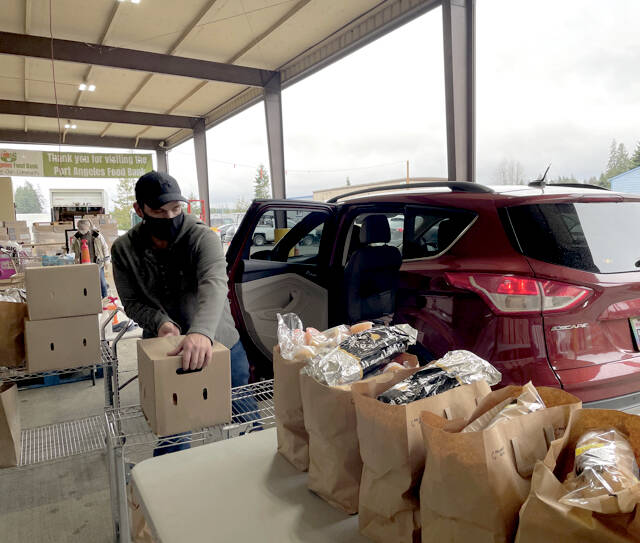 Port Angeles Food Bank workers hand out bags of food supplies and sanitization products to a long line of cars Wednesday afternoon. More than 90 people came to the drive-thru by 2 p.m. The food bank is currently preparing an indoor shopping area that is expected to be open early this year.