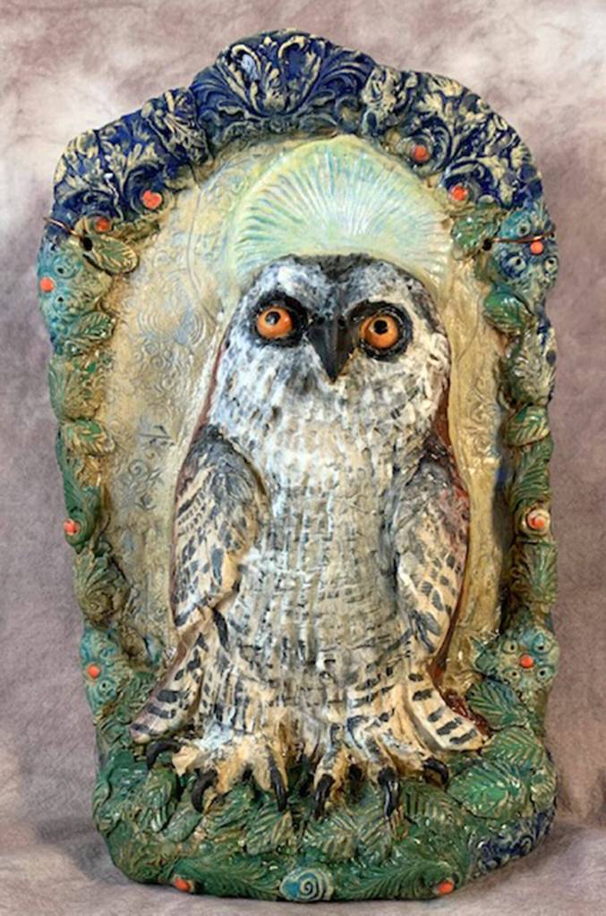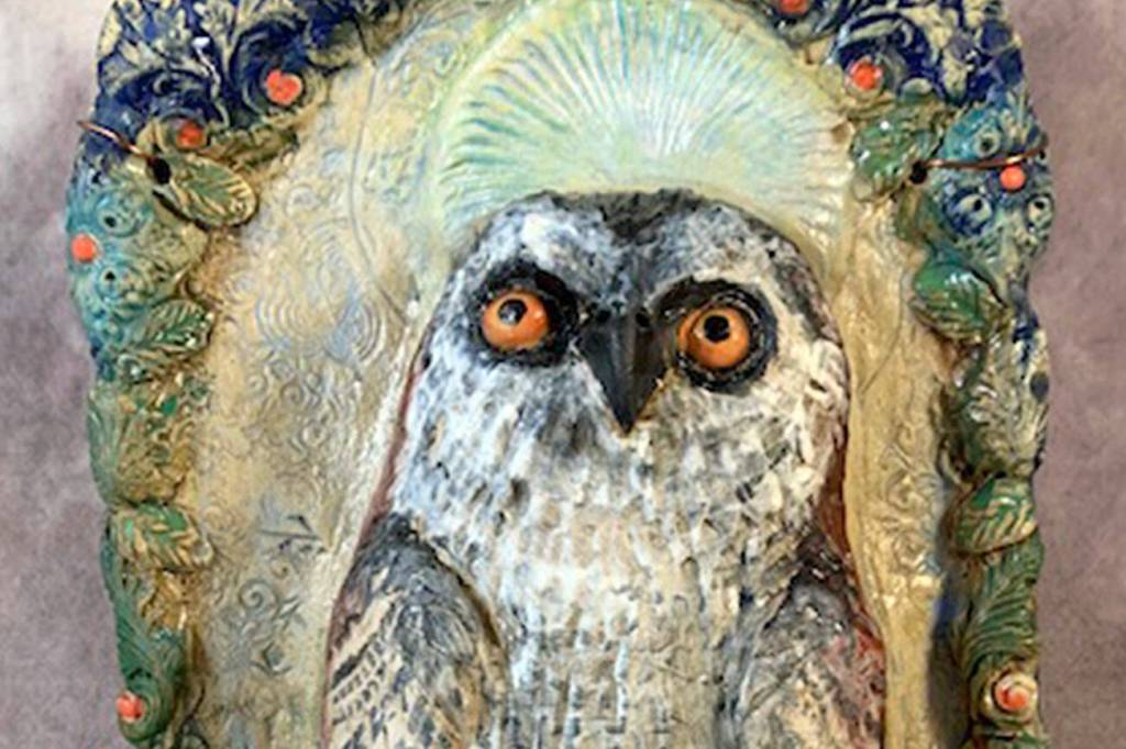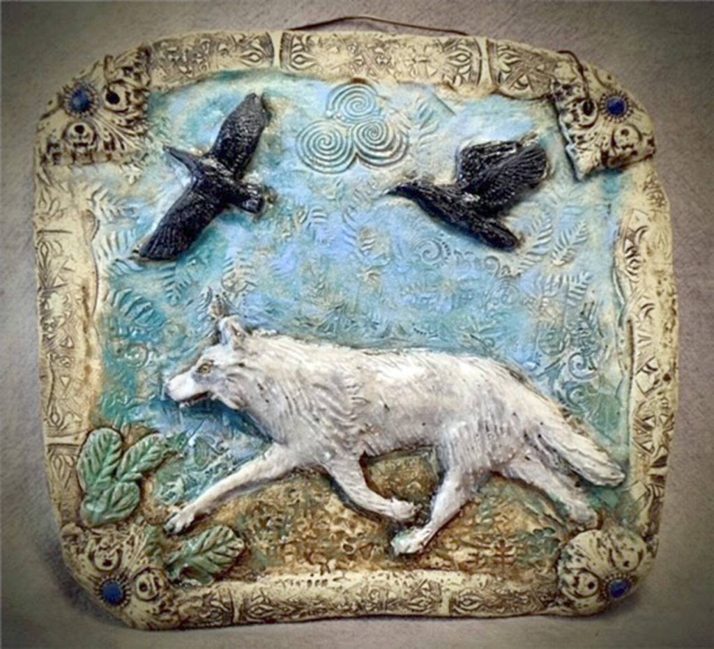Fitch is a self-taught artist making bas relief stoneware ceramic tiles and sculptures. Gallery organizers describe her work as earthy folk art with a whimsical and spiritual nature.