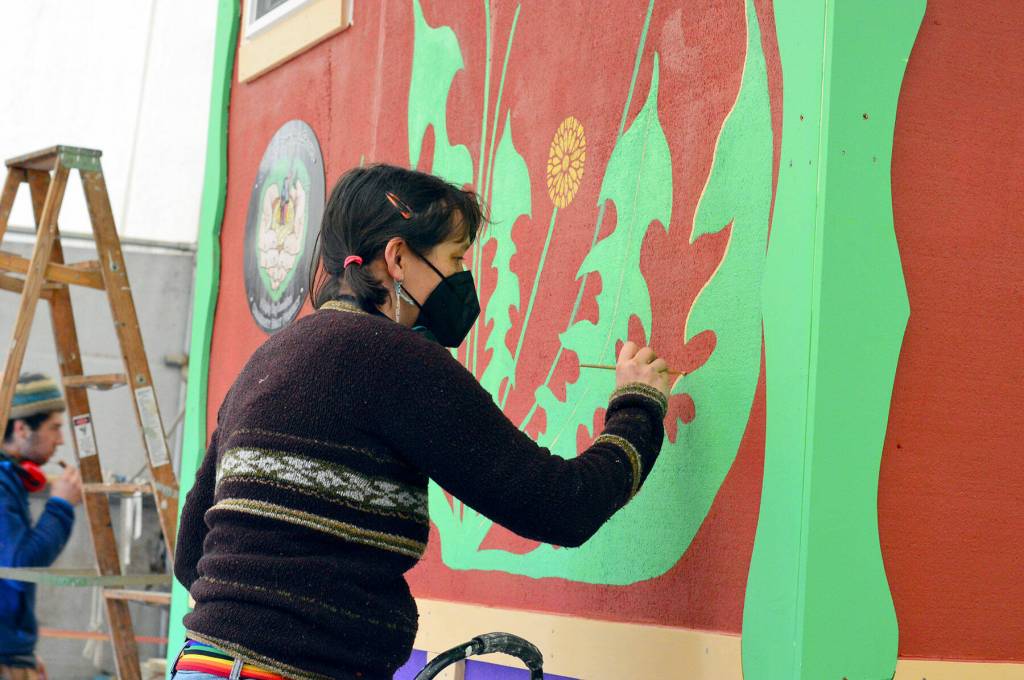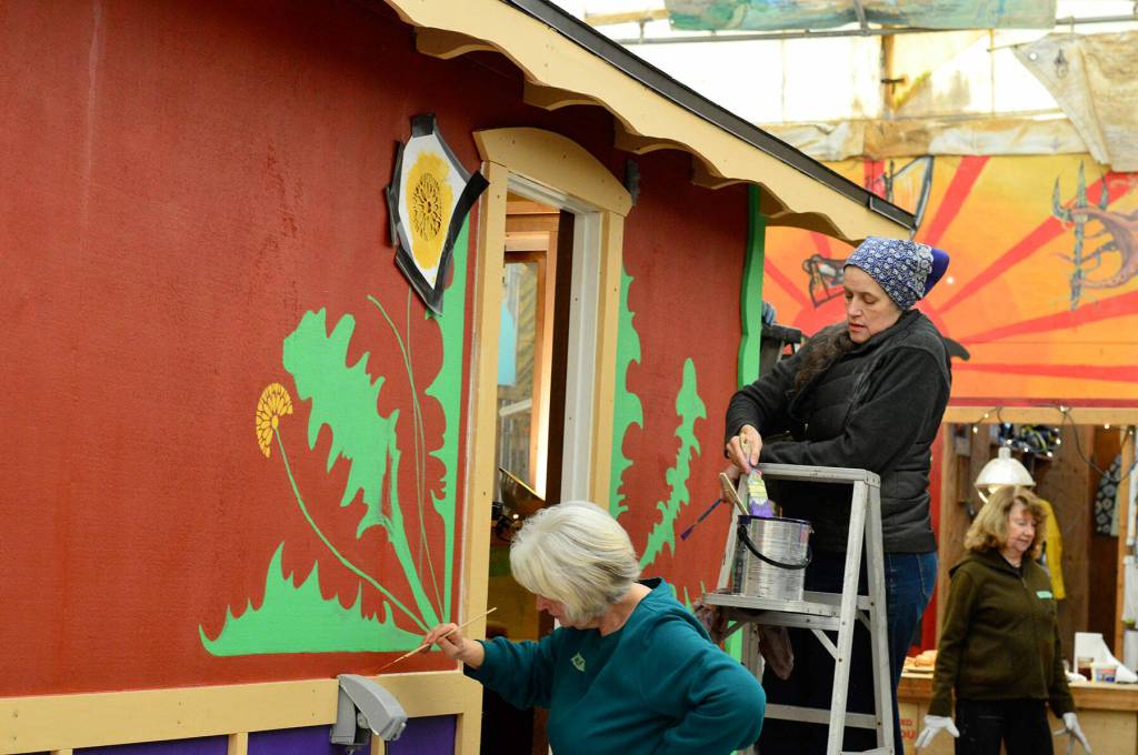 Muralist Danielle Fodor paints the newest tiny home, named Meadow Manor, at the Community Boat Project shop in Port Hadlock on Tuesday. The 160-square-foot home is an example of the housing to be built for farmworkers in Chimacum. (Diane Urbani de la Paz/Peninsula Daily News)