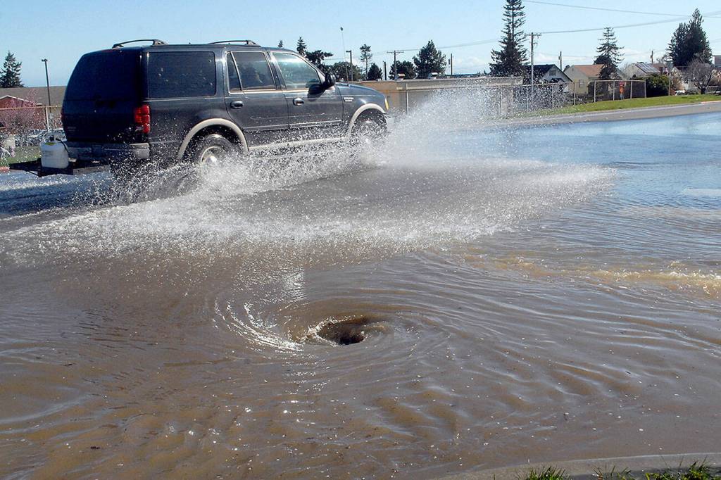 Traffic splashes along East Lauridsen Boulevard as water from a main break flows into a storm drain at South Chase Street on Wednesday after a 6-inch water line burst in the 200 block of East Orcas Avenue in Port Angeles. Repairs were expected to be completed by about 6 p.m. Wednesday, according to a report posted late Wednesday afternoon on the city website. Some 54 customers were affected and were under a boil-water advisory, city officials said.