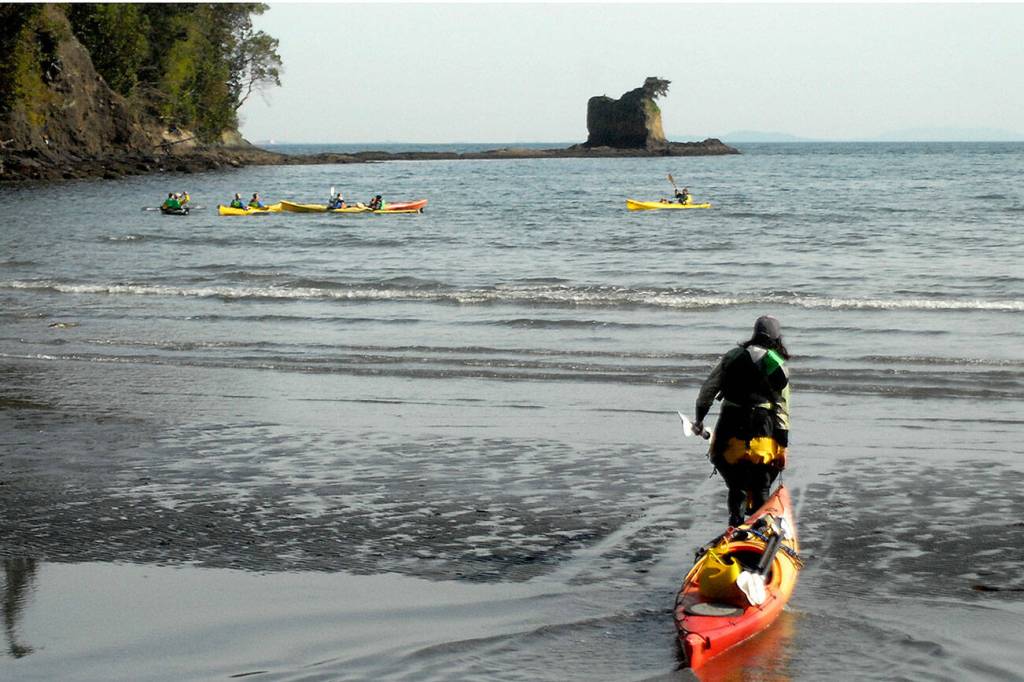 Nina Sarmiento, a sea kayak guide with Adventures Through Kayaking, pulls out to lead a group of kayakers in the waters of Freshwater Bay west of Port Angeles on Thursday.