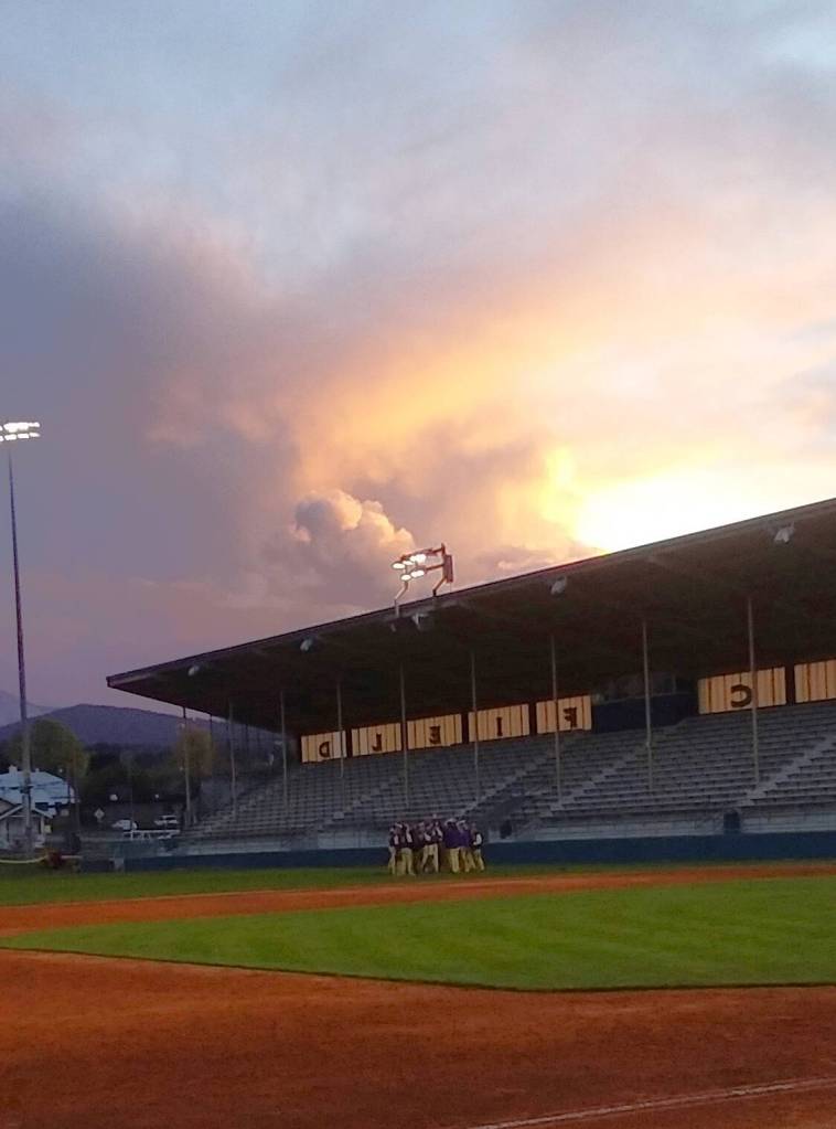 The sun sets behind storm clouds as the Sequim baseball team meets at Port Angeles Civic Field at the conclusion of Monday night’s baseball game.	(Pierre LaBossiere/Peninsula Daily News)