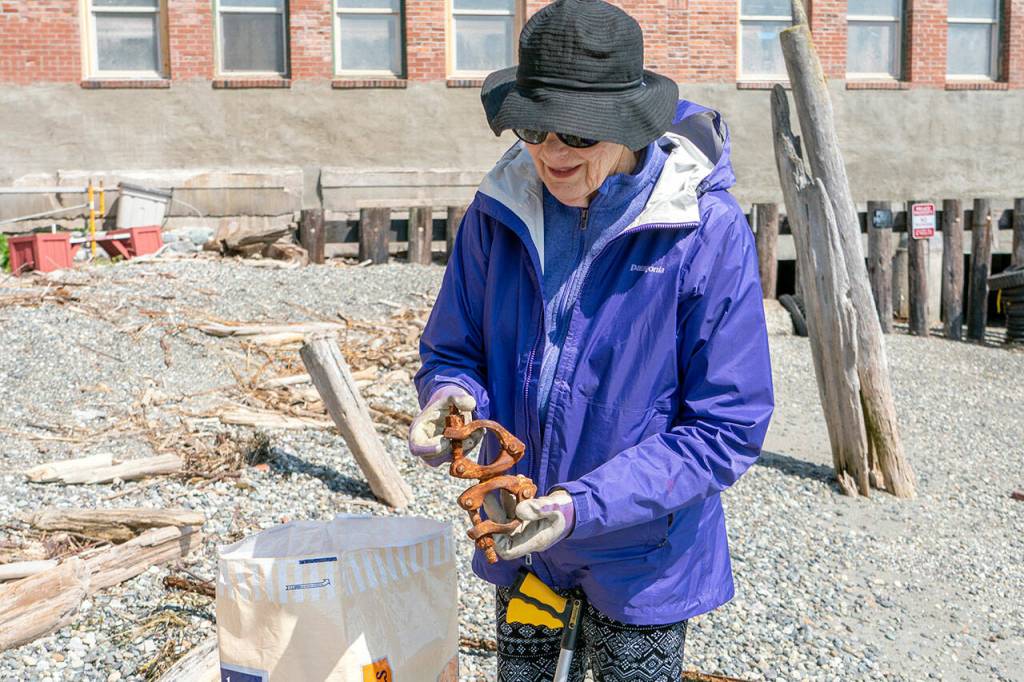 Chelsea Rosenberger, right, and sons Josiah and Micah, go through the bits of trash they picked up along a beach at Fort Worden State Park on Saturday as their volunteer contribution for Earth Day. The family participated in a beach cleanup sponsored by the Marine Science Center in Port Townsend.