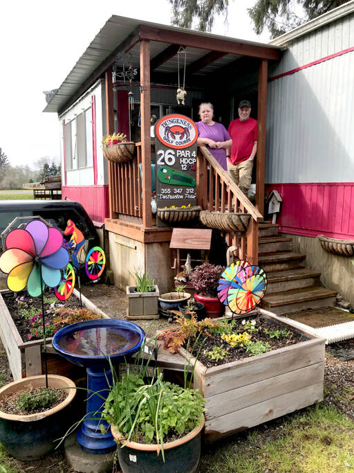 Their small, neat yard contains raised garden beds Jerry Janssen built, and a Dungeness Golf Course tee sign given to him when he retired as its assistant supervisor is posted at the entry.