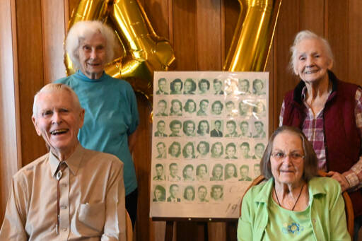 Four classmates of Sequim High School’s Class of 1947 — Robert Clark, Dorothy Daniels (now Ludke), Mary Dryke (now Pogue) and Ramona Heaton (now Robb) — celebrated their 75th reunion with a meal, some cake and family fanfare at the Mariner Café on May 3.