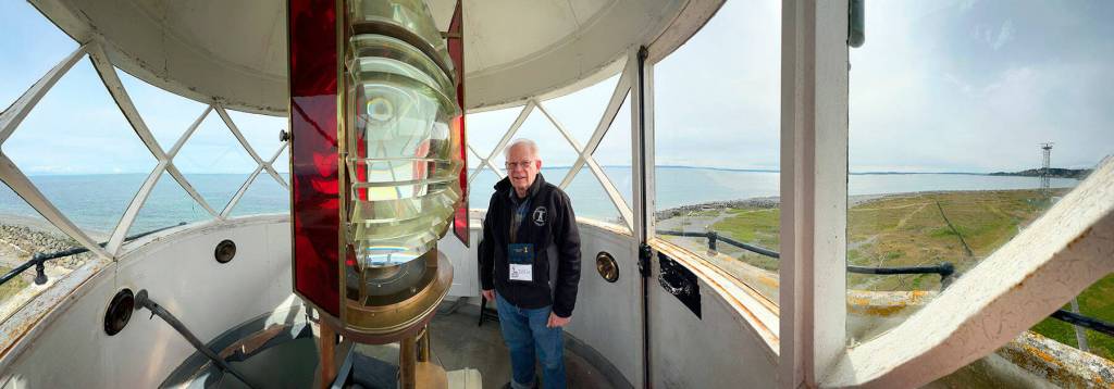 Dick Richardson, volunteer coordinator of the U.S. Light House Society, shows off the 1880’s French made fresnel lens at the top of the Point Wilson Light at Fort Worden State Park.