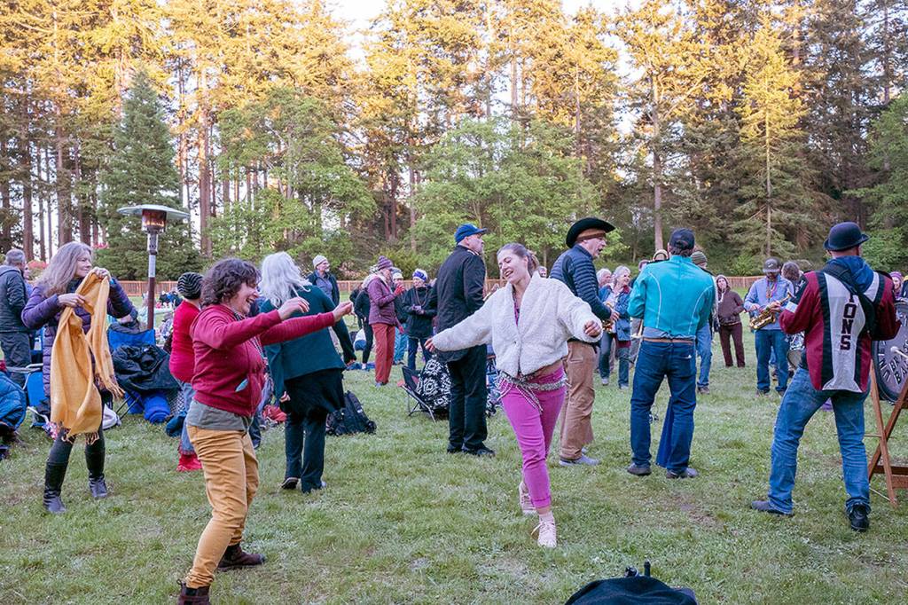 Port Townsend business owner Connie Segal dances with a friend to the brassy notes of the Unexpected Brass Band during the start of Chautauqua Week on Littlefield Green at Fort Worden State Park on Friday.