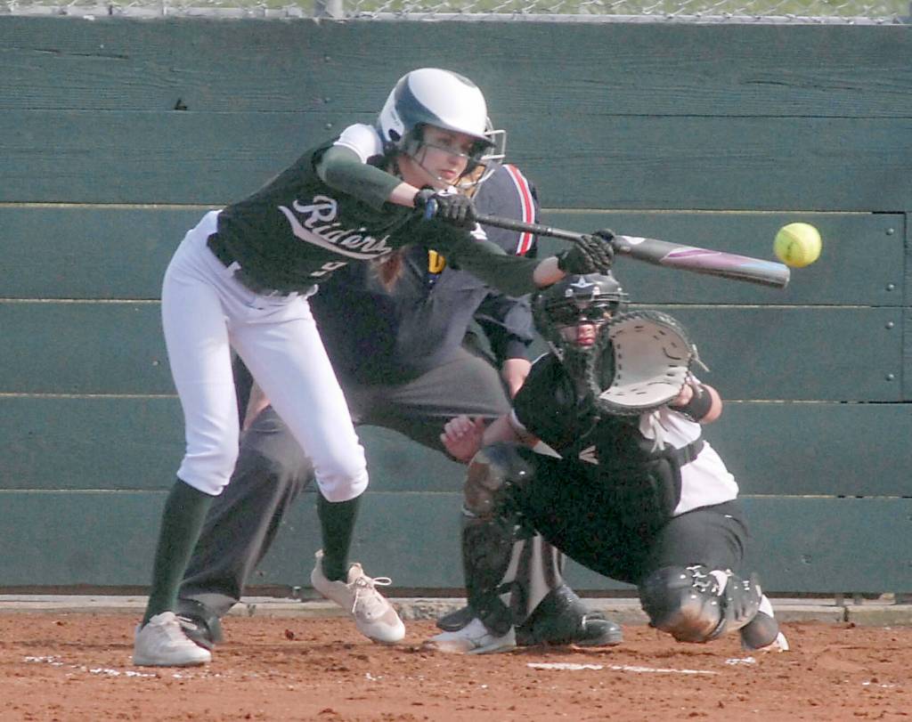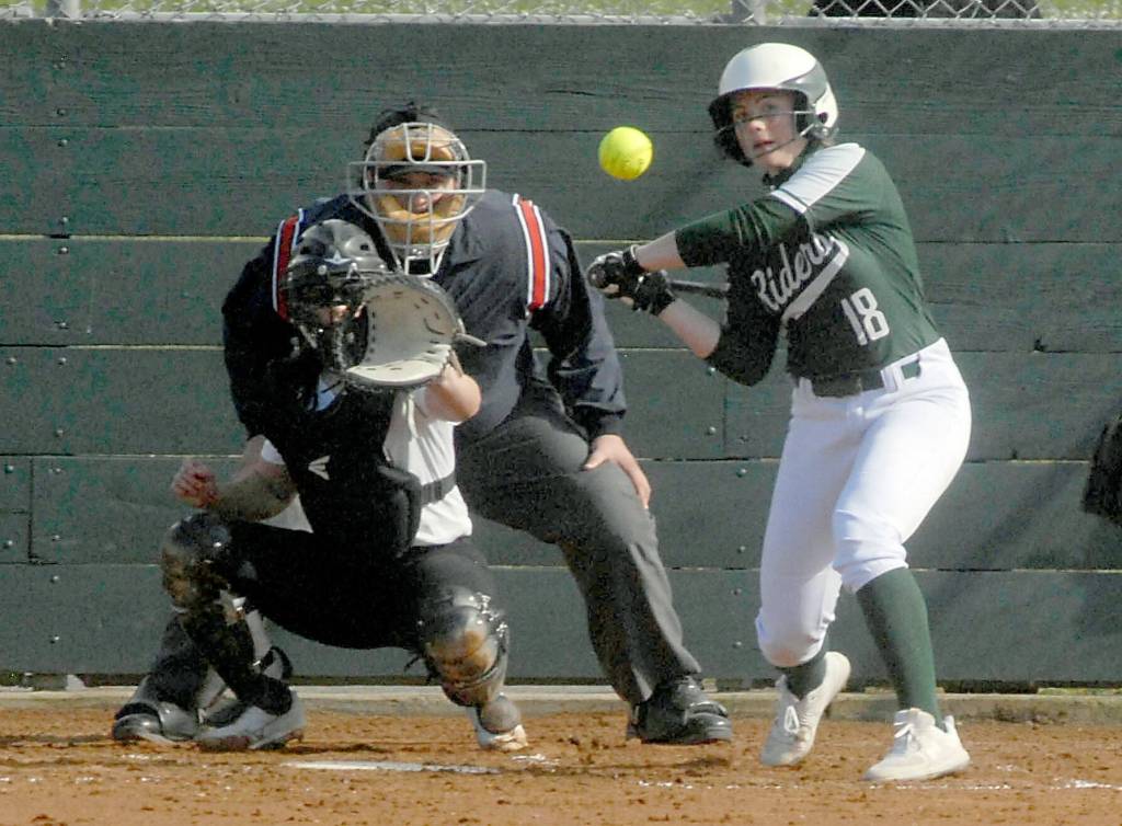 Port Angeles' Lily Halberg bats in an April game against Kingston at Dry Creek School in Port Angeles.
