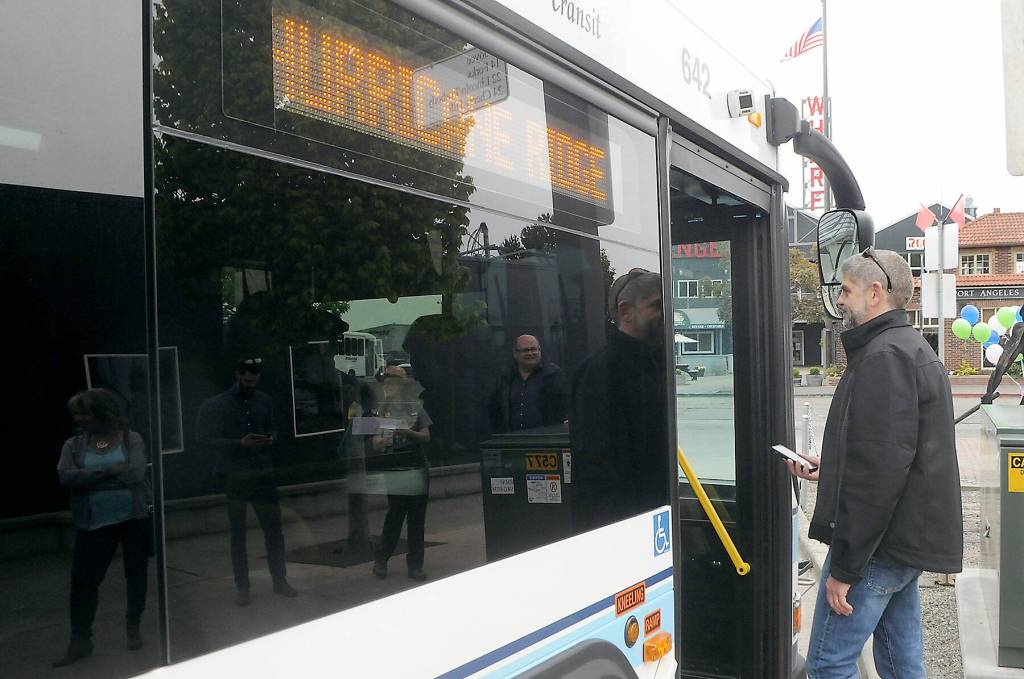 Clallam County Commissioner Mark Ozias, who is also chairman of the Clallam Transit Board of Commissioners, boards the first bus from Port Angeles to Hurricane Ridge on Wednesday. (Keith Thorpe/Peninsula Daily News)
