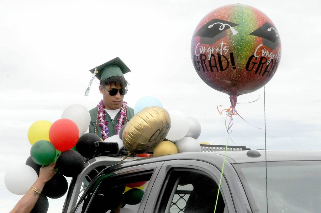 Port Angeles High School graduates, from left, Hannah Basden, Zoe Smithson, Peyton Rudd and Jenna McGoff inflate balloons that will adorn a car taking part in Friday’s graduation parade through the streets of Port Angeles from Ediz Hook to the high school. The parade, developed to honor graduates after COVID-19 forced the cancellation of commencement in 2020, was kept as a prelude to the conventional ceremony at Port Angeles Civic Field.