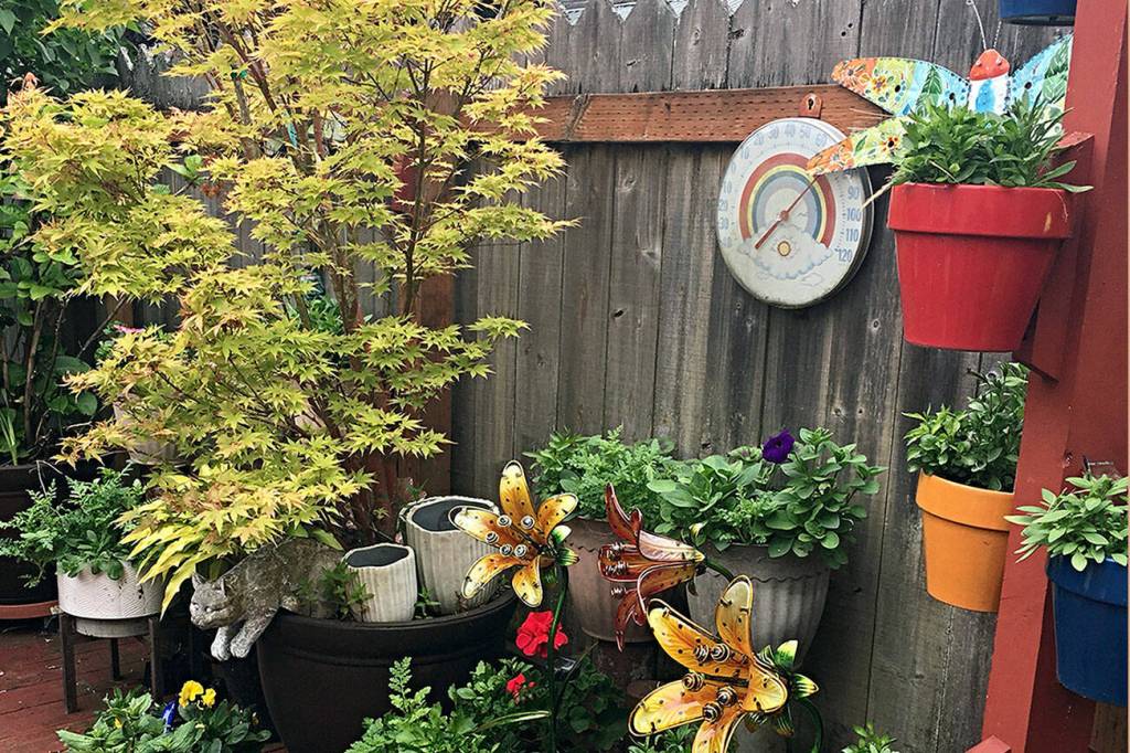 It demonstrates how a small yard can be transformed above ground with containers filled with color-unique annuals and perennials, hanging baskets and trees. The over 100 hanging baskets are grown each year from seed.