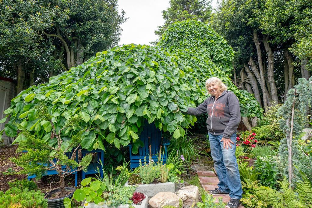 Kathy Kunc of Port Townsend shows off the 150-year-old Camperdown Elm, which was featured Saturday as part of the Secret Garden Tour hosted by the Jefferson County Masters Gardeners Foundation.