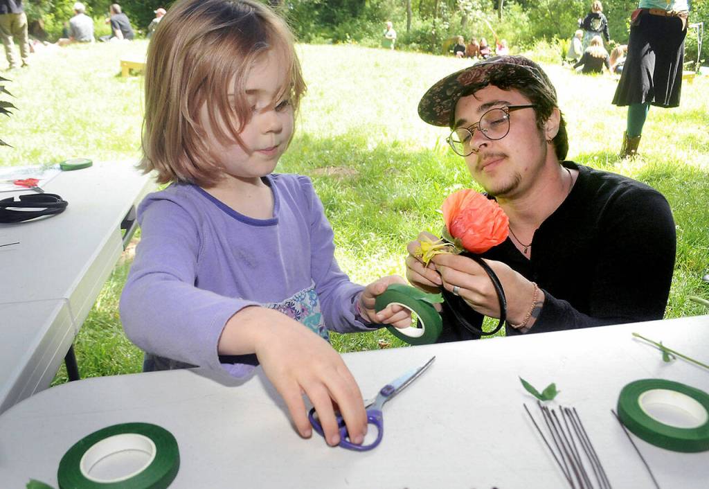 Volunteers at the tent assisted children and adults in selecting from daisies, salal, sword ferns, marigolds, mint, chives, and lavender, among other things, and wrapping them around a headband and securing them with a pipe cleaner or floral tape.
