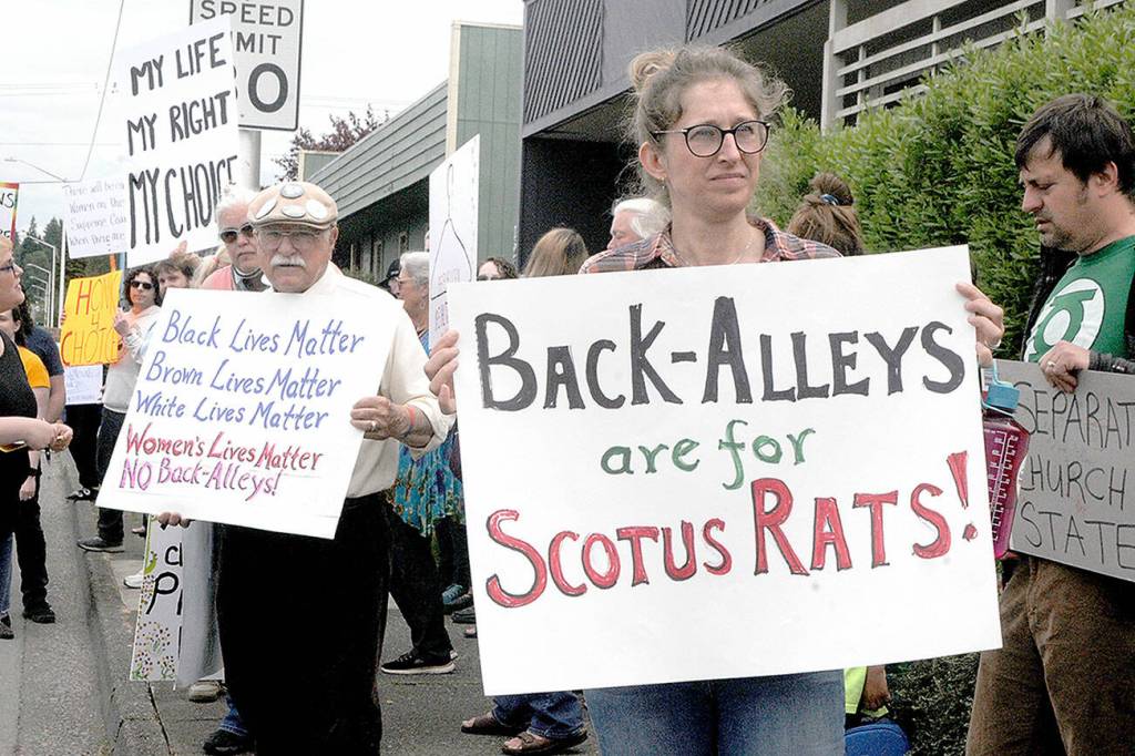 Tim Wheeler of Sequim, center left, and Lillian Easton of Port Angeles, hold signs in favor of reproductive rights during a rally that began at Planned Parenthood in Port Angeles and ended up at the Clallam County Courthouse.