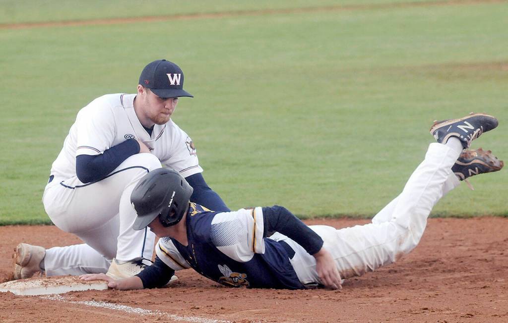 Wilder Senior’s Beckett Jarnigan looks up after successfully stealing second as NW Sting’s Fritz Mangan and Alex Pantan, right, watch the infield on Saturday at Port Angeles Civic Field. (Keith Thorpe/Peninsula Daily News)