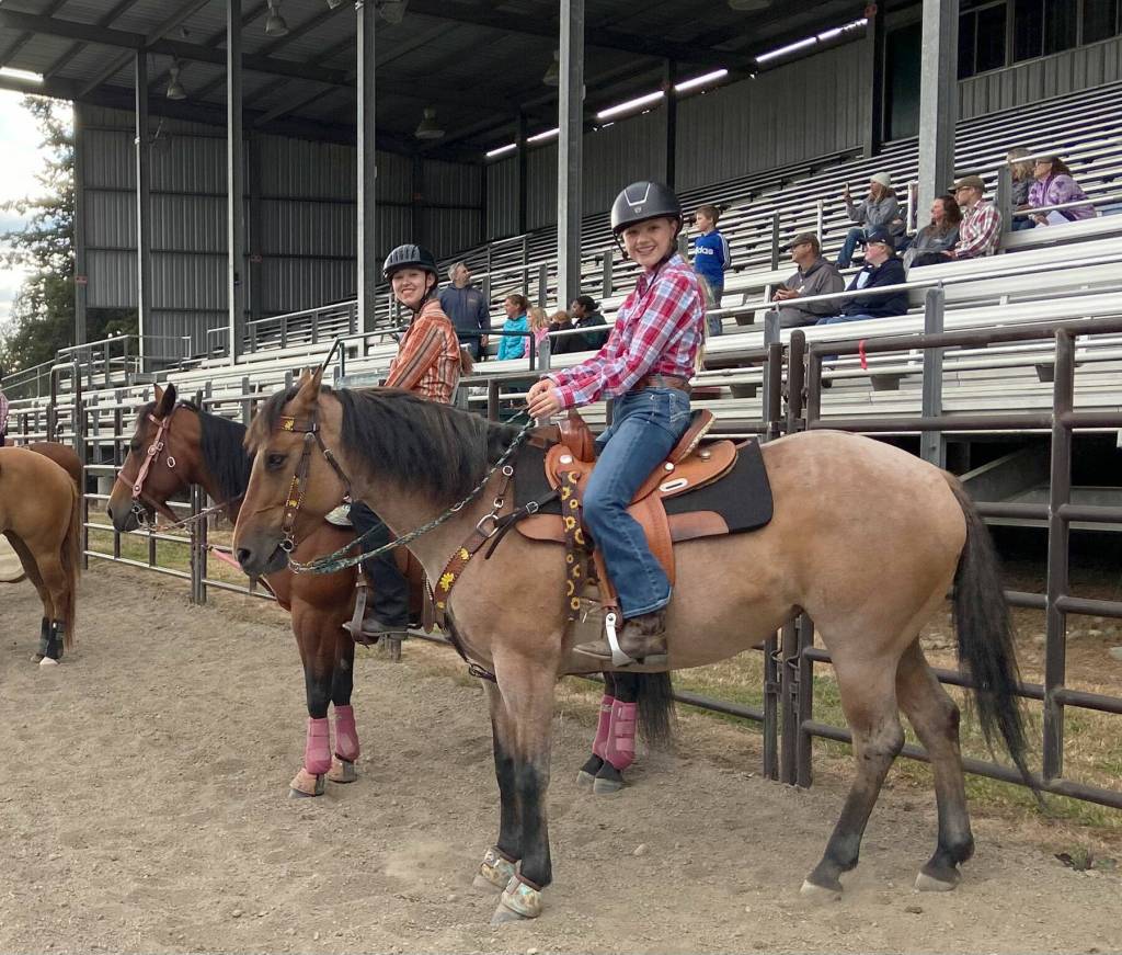 Fair pre-show Reserve High Point Games winner in the intermediate division Katelynn Sharpe, left, on Millie, with High Point Games winner Asha Swanberg on Bling. (Submitted by Katie Newton)