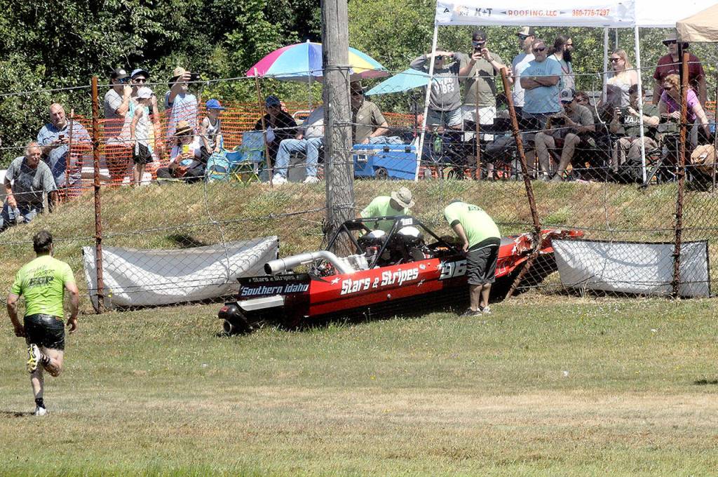 “Island hopper” safety personnel race to the Starts & Stripes boat after driver Burt Roberts and navigator Nichole Heaton left the Extreme Sports Park track and crashed nose-first through a safety fence on Saturday during sprint boat races in Port Angeles.