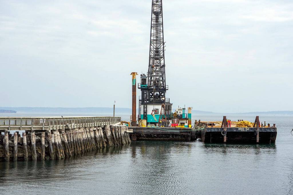 The booms will contain and extract any oil residue that might leak from the pilings. A groundbreaking ceremony is set today.