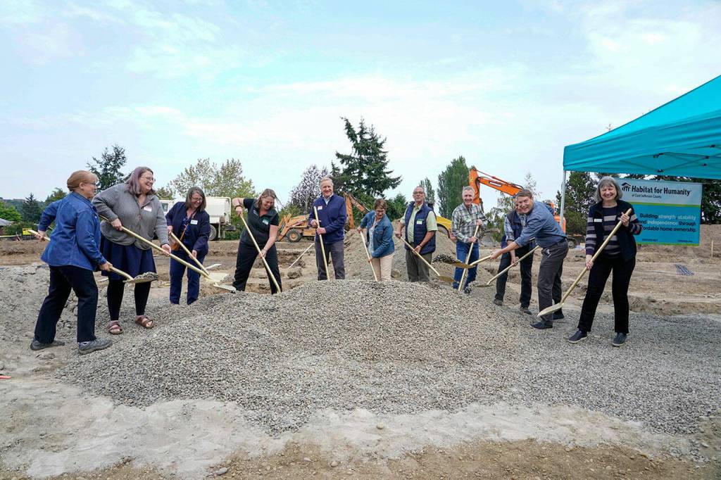 Port Townsend mayor David Faber, second from the right, and other dignitaries shovel gravel to break ground on a 6 permanent, affordable housing project for Habitat for Humanity project at 18th and Landes Streets in Port Townsend on Wednesday.