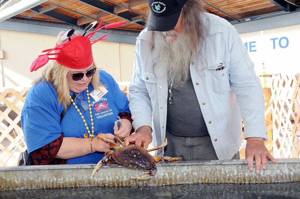 Denise Butler, left, and Karl Pohlod, both members of the North Olympic Peninsula Chapter of Puget Sound Anglers, on Friday tie plastic markers to a crab that will be eligible for catch during the Grab-A-Crab Derby, a featured activity of the Dungeness Crab and Seafood Festival on the Port Angeles waterfront. Twenty tagged crabs were seeded into a pair of tanks, allowing the catchers a $20 discount on a crab dinner or half off on a takeout crab from the derby, which is also set for today from 10 a.m. to 6 p.m. Daniel and Katherine Safarik of Wichita, Kan., enjoy a crab dinner in the dining tent on Friday at the Dungeness Crab and Seafood Festival near the Port Angeles waterfront. The festival continues today and Sunday with a wide variety of food, entertainment and activities, as well as a craft fair at Port Angeles City Pier. For information, see crabfestival.org.