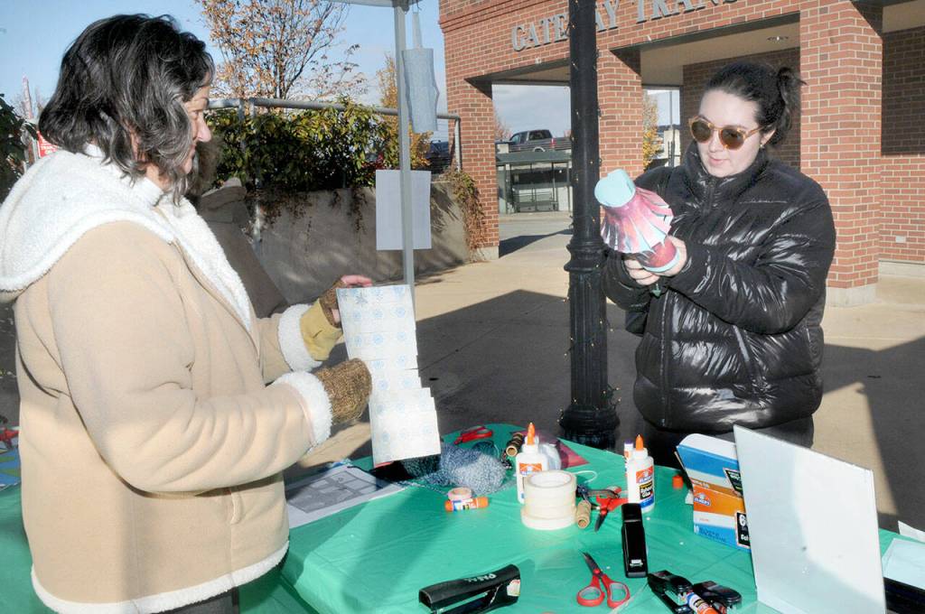 Laurel Hargis, left, and McKenzie Elliott, both of Port Angeles, assemble decorative paper lanterns on Saturday at the Port Angeles Farmers Market at The Gateway.