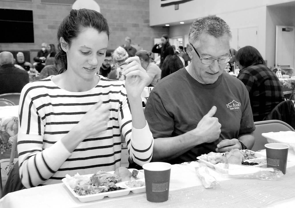 Cecilia Stevenson, of Dallas, left, and her father, Will Stevenson of Port Angeles, say a blessing before enjoying a Thanksgiving meal in the fellowship hall of Queen of Angels Catholic Church in Port Angeles. The church offered a traditional Thanksgiving dinner for the community, with several hundred diners taking advantage of the in-house meal. Numerous other dinners were sent out for in-home dining.