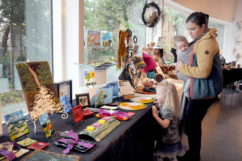 Molly Brown of Port Angeles, and her children, Lucy Brown, 3, and Oliver Brown, 5 months, examine a display of locally-produced art items for sale as gifts on Thursday during the holiday Makers Market at the Port Angeles Fine Arts Center. The market, open Thursday through Sunday from 11 a.m. to 5 p.m. and from 5 p.m. to 8 p.m. Dec. 16, will observe extended hours of 11 a.m. to 8 p.m. for ticket holders during the Wintertide Festival of Lights on Saturday.
