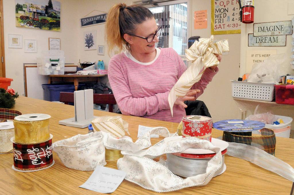 Volunteer wreath maker Sarah Branham admires her work after weaving a bow that will become part of a decorative swag for sale at the non-profit Sprouting Hope Greenhouse operated by The Answer for Youth on Wednesday in Port Angeles.