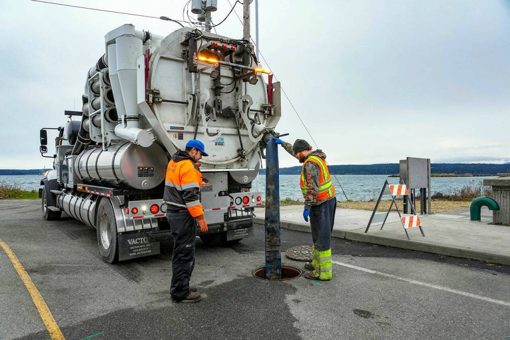 Rafe Thornton, left, and Lane Dotson, both with the City of Port Townsend Street, Sewer and Storm department, vacuum sewage out of the manhole and into the truck on Thursday, in order to facilitate repairs to the broken sewer line at Gaines and Water streets in Port Townsend on a newly installed sewer line damaged by recent storm and tidal activity.