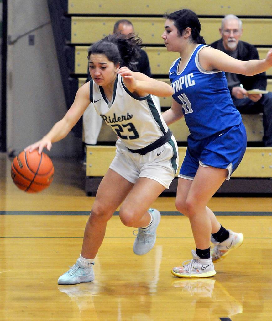 Piper Williams of Port Angeles dribbles in on the baseline as Olympic's Angelina Godinez-Gonzalez guards the approach on Thursday night at Port Angeles High School.