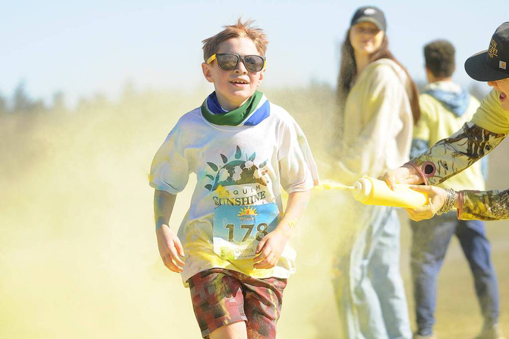 Owen DeAngelo grins as he gets a touch of yellow at the last color station at the Sun Fun Color Run 5K in 2022 at the Albert Haller Playfields just north of Carrie Blake Community Park. Entries remain open for the 1K and 5K run/walk races on Saturday. (Michael Dashiell/Olympic Peninsula News Group)