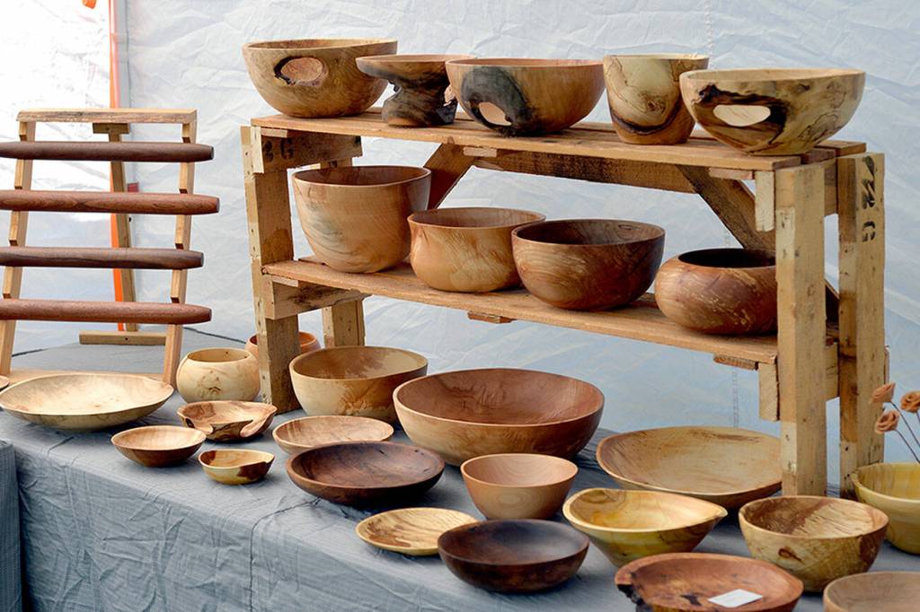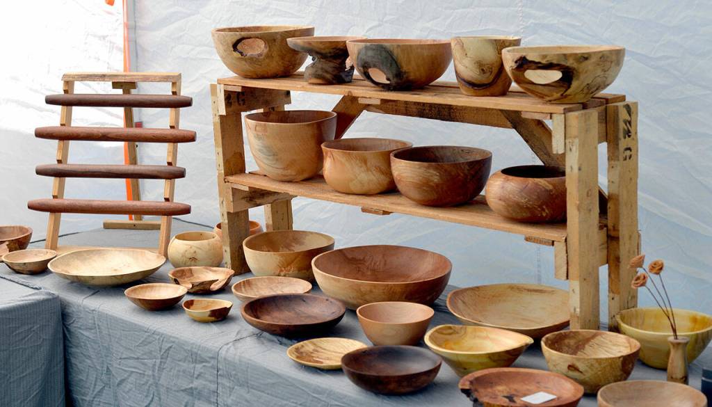 Work by Jennifer and Davis Stevenson, such as these bowls and rolling pins, are on display at Harbor Art Gallery.