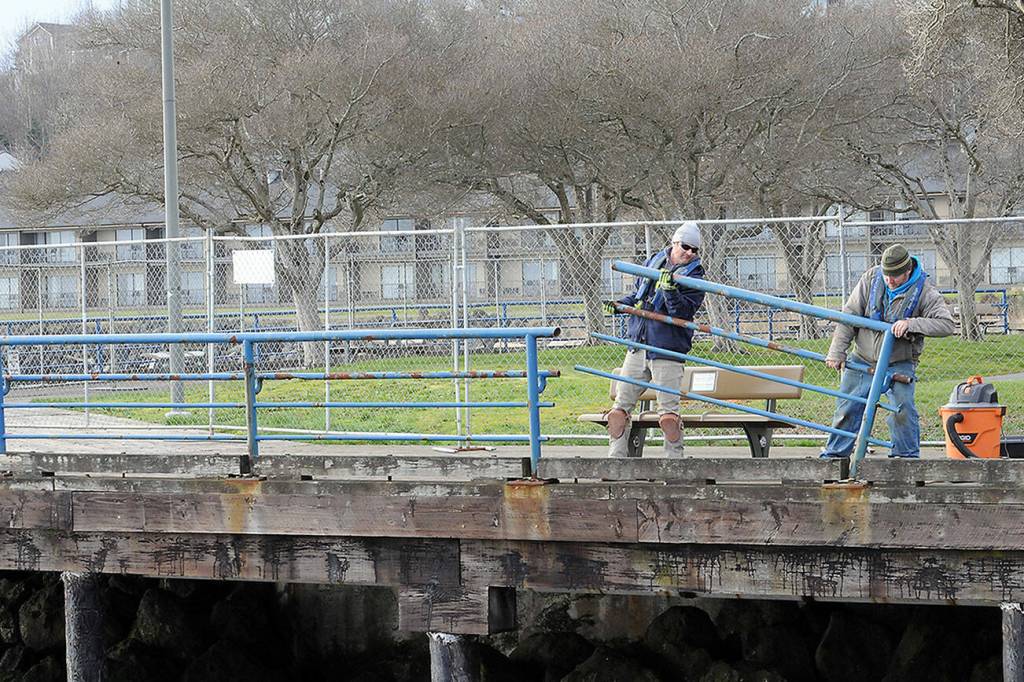 Brian Tucker, left, and Kevin Smith, workers with the Sequim branch of Neely Construction Co., remove a section of rusted railing at Port Angeles City Pier on Thursday.. The project calls for replacement of 1,300 linear feet of pedestrian railings that were installed in the 1970s with corrosion-resistant galvanized steel barriers around the pier and walkways. The project is expected to be completed in June.