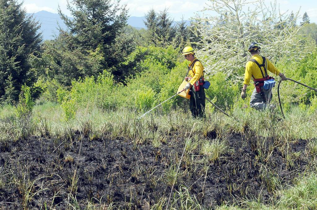 Clallam County Fire District 2 firefighters Chris Dalen, left and Zach Gear put out hot spots around the perimeter of a brush fire near 2333 Lower Elwha Road on Friday. The fire burned an area approximately 200 feet by 200 feet while scorching a tree and threatening a nearby mobile home.