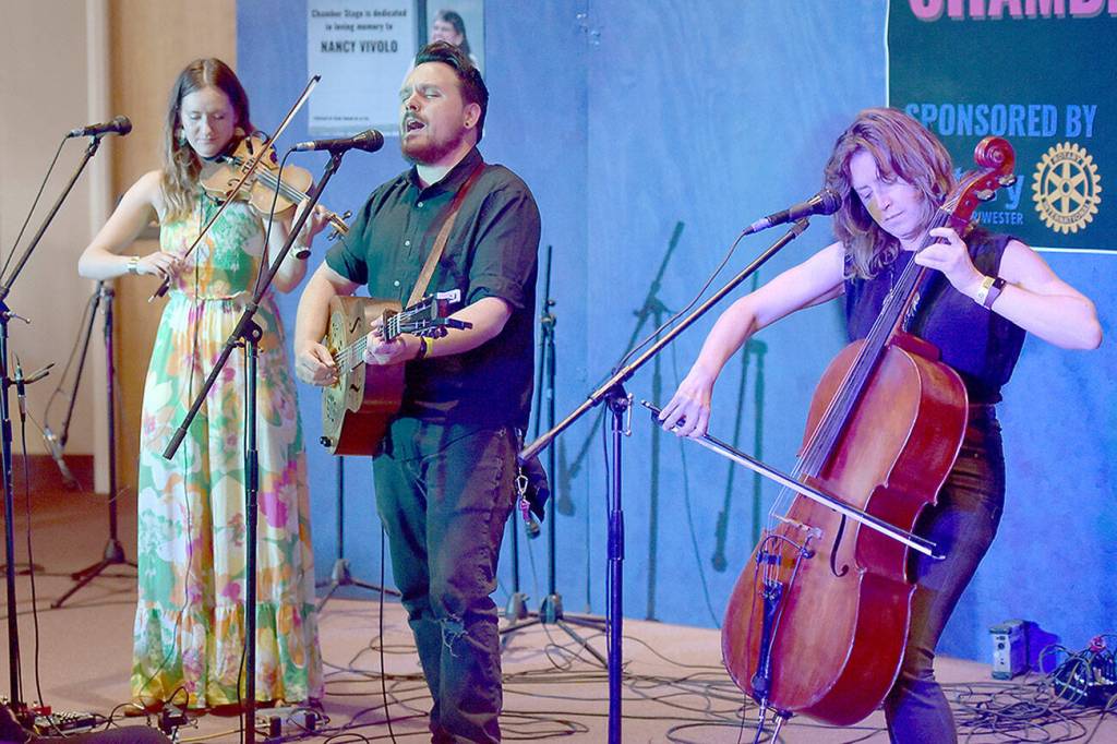 Sam Chase, center, performs with The Sam Chase Trio, Chandra Johnson, left, and Devon McClive, on Saturday at the Chamber Stage of the Juan de Fuca Festival. (Keith Thorpe/Peninsula Daily News)