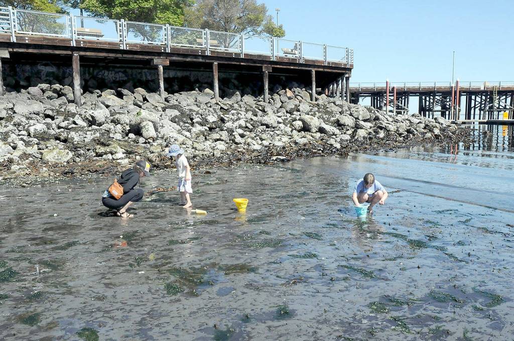 Jill Zarzeczny of Port Angeles, left, and her children, Althea Zarzeczny, 4, and Lupine Zarzeczny, 9, look for marine life beneath the sand during Tuesday’s low tide at Hollywood Beach in Port Angeles. The -2.99 tide qualified as one of the lowest of the year with tides of -2.53 at La Push, -2.70 at Makah Bay, -2.55 at Seiku, -2.74 at Crescent Bay, -3.08 at Dungeness, -3.42 at Port Townsend and -3.82 at Dabob Bay. Similar low tides are forecast for the rest of the week across the North Olympic Peninsula.