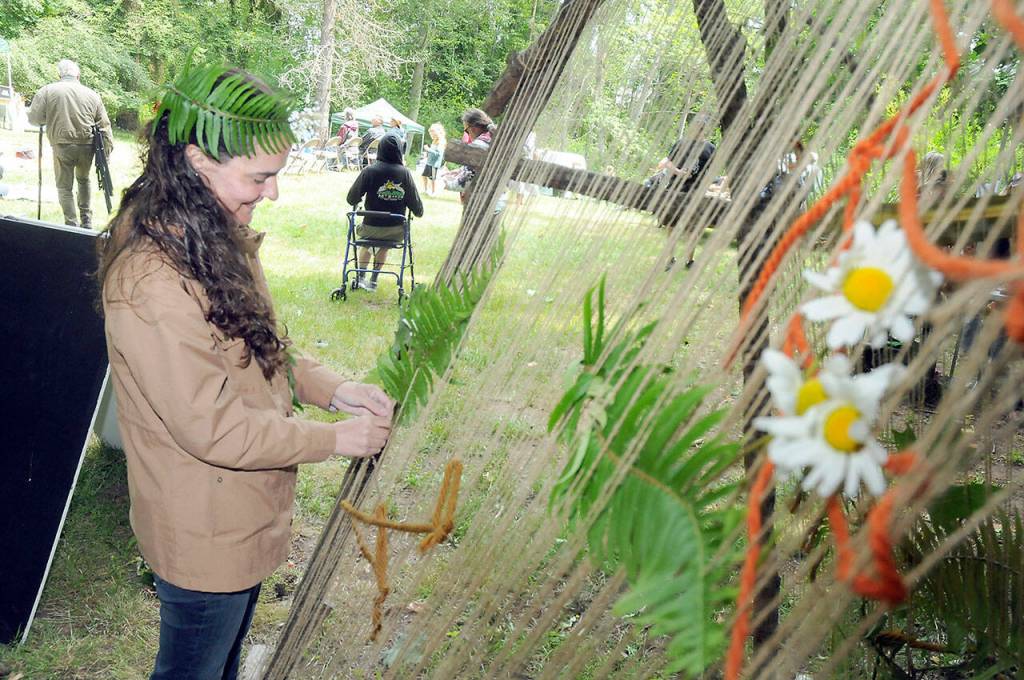 Danielle Keith of Port Angeles created a solstice crown for her 6-year-old daughter, Sophie, at a tent at the edge of the meadow where tubs of daisies, carnations, salal, sunflowers and sword ferns waited to be transformed into colorful floral headdresses.