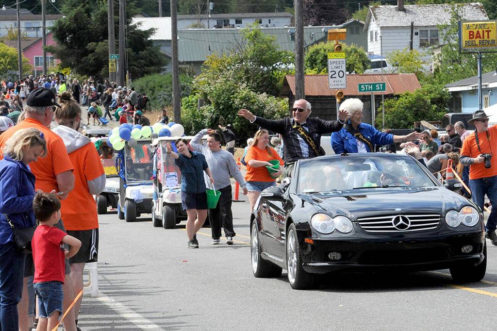 Wes Fitzpatrick and Lorna Konopaski, grand pioneers for the Clallam Bay-Sekiu Fun Days parade, wave to the crowd on Saturday.