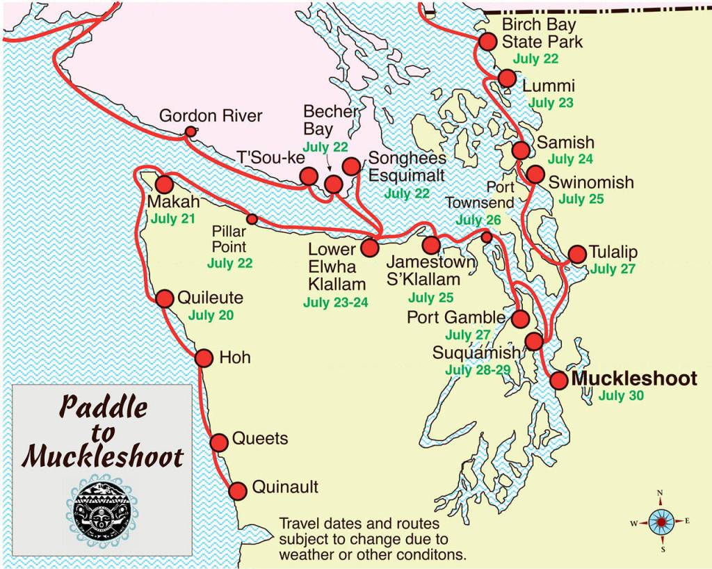 On July 23, canoe families from the West End and Vancouver Island will arrive in Port Angeles for two days hosted by the Lower Elwha Klallam Tribe before heading east. Families are expected at Jamestown Beach on July 25 and in Port Townsend on July 26.