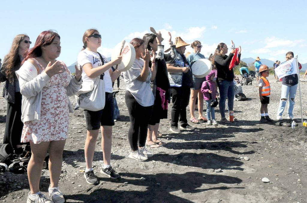 Singers welcome an incoming canoe from the beach on Lower Elwha Klallam territory near the mouth of the Elwha River on Sunday. (Keith Thorpe/Peninsula Daily News)