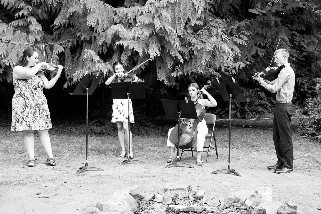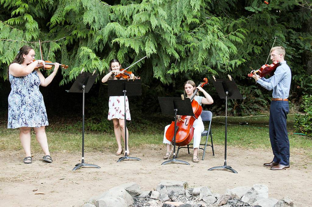 The Olympic Strings Workshop at Lake Crescent will present a free public concert Friday afternoon. Pictured during the 2022 camp are, from left, Marley Cochran, Courtney Smith, Jacklyn Minnoch and Luke Gavin. photo by Dewi Sprague/Olympic Strings Workshop