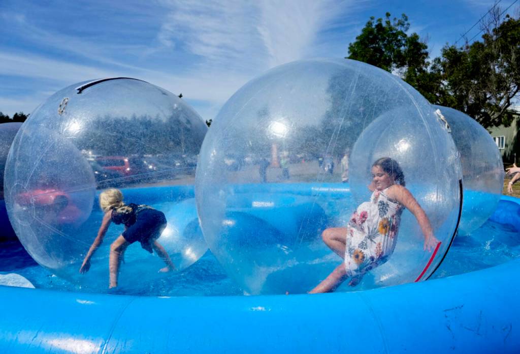 Emma Miller, 11, right, and best friend Lorelei Sanders, 11, both from Sequim, bounce around in the floating bubbles while at the 2023 Jefferson County Fair on Friday. Events today will include Washington draft horse pulls at 3:30 p.m. On Sunday, the 4-by-4 mud drag events begin at 11 a.m. 4-H and FFA exhibits and music are on both days. The fairgrounds at 4907 Landes St. in Port Townsend open to the public at 10 a.m. each day; the grounds close at 8 p.m. Saturday and at 6 p.m. Sunday. Gate admission prices are $8 for adults, $6 for seniors 65 and older and for students 13 to 17 years old, $2 for children from 6 to 12 years old and free for children 5 and younger, with a military discount available. For more see https://jeffcofairgrounds.org/.