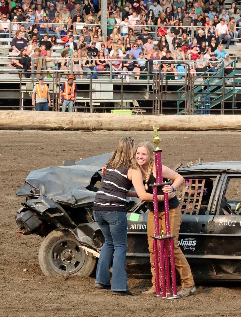 Amber Charles receives a trophy from derby organizer Julia Little for winning the powder puff division of the Clallam County Fair demolition derby.