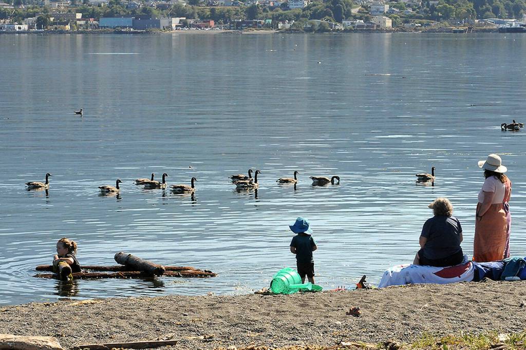 A line of Canada geese floats past family members, from left, Maisie Christison, 8, Apollo Christison, 3, grandmother Elizabeth Keitel of Wallace, Idaho, and mother Megan Christison of Port Angeles, on a warm day on Ediz Hook in Port Angeles.