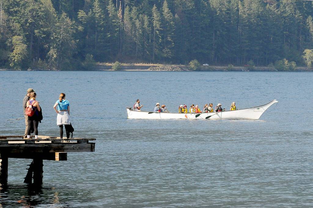 A canoe containing visitors to Nature Bridge at Lake Crescent in Olympic National Park makes its way past the dock at Lake Crescent Lodge on Thursday.