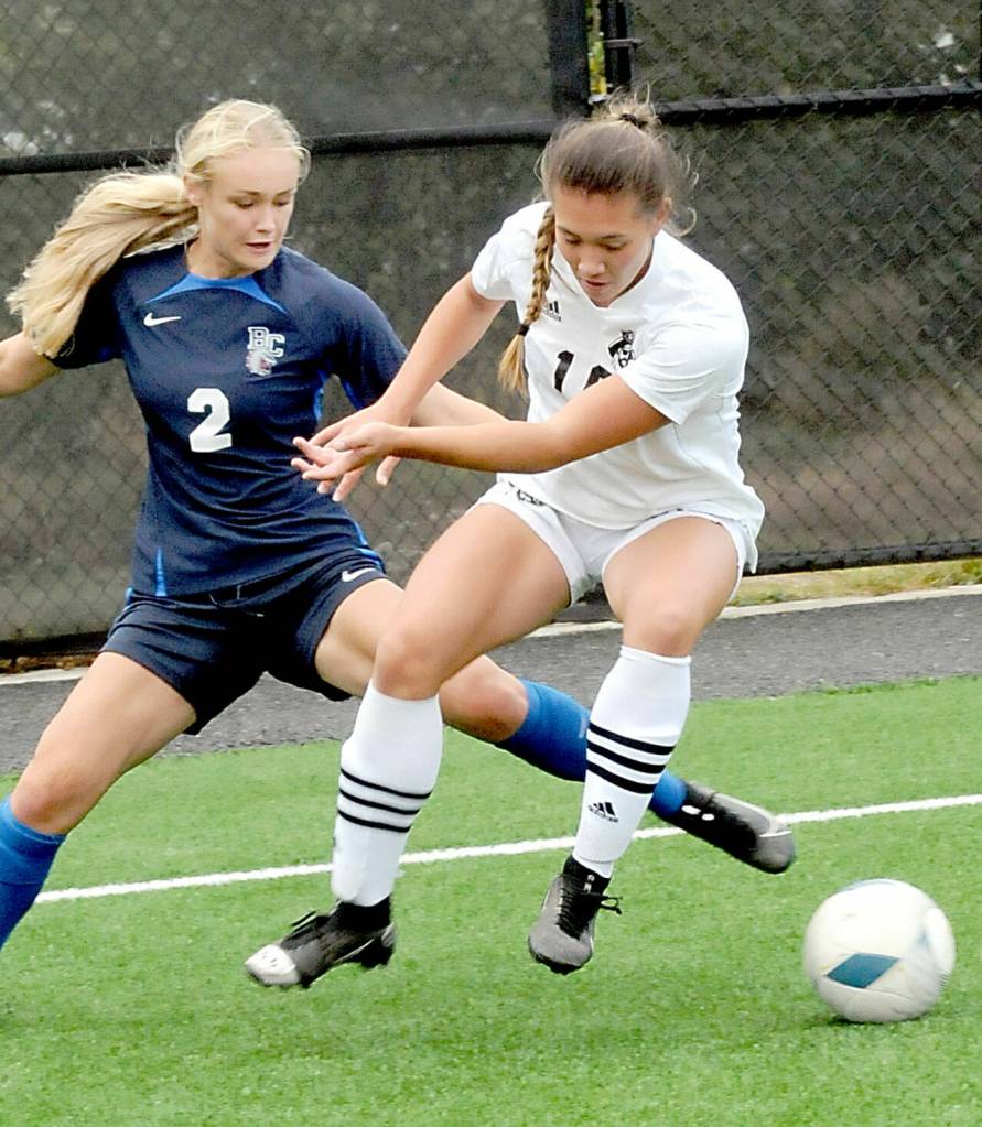 KEITH THORPE/PENINSULA DAILY NEWS Peninsula’s Shawna Larson, right, steps between the ball and Bellevue’s Jolie Widaman on Saturday in Port Angeles.